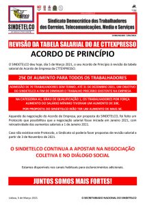 A “Frente Sindical deu o seu acordo de princípio à proposta da empresa, ficando o SINDETELCO isolado e sem hipóteses de continuar a negociação da Tabela Salarial e Matéria de Expressão Pecuniária.