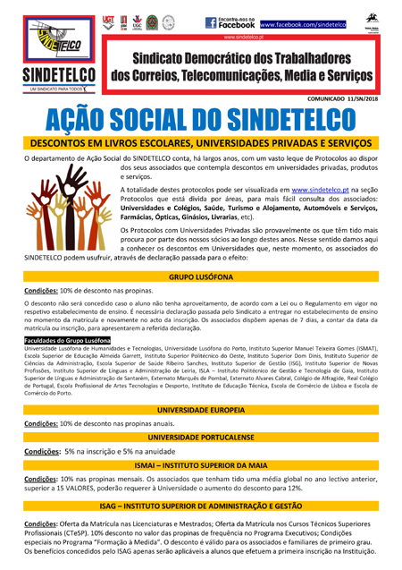 Se é sócio do SINDETELCO e tem filhos em idade escolar o SINDETELCO, à semelhança de anos anteriores, ajudá-lo-á na compra de livros e auxiliares escolares com facilidades de pagamento em prestações sem juros (máximo 4 prestações), sem cobrança de qualquer custo adicional e entrega dos manuais diretamente aos sócios.
